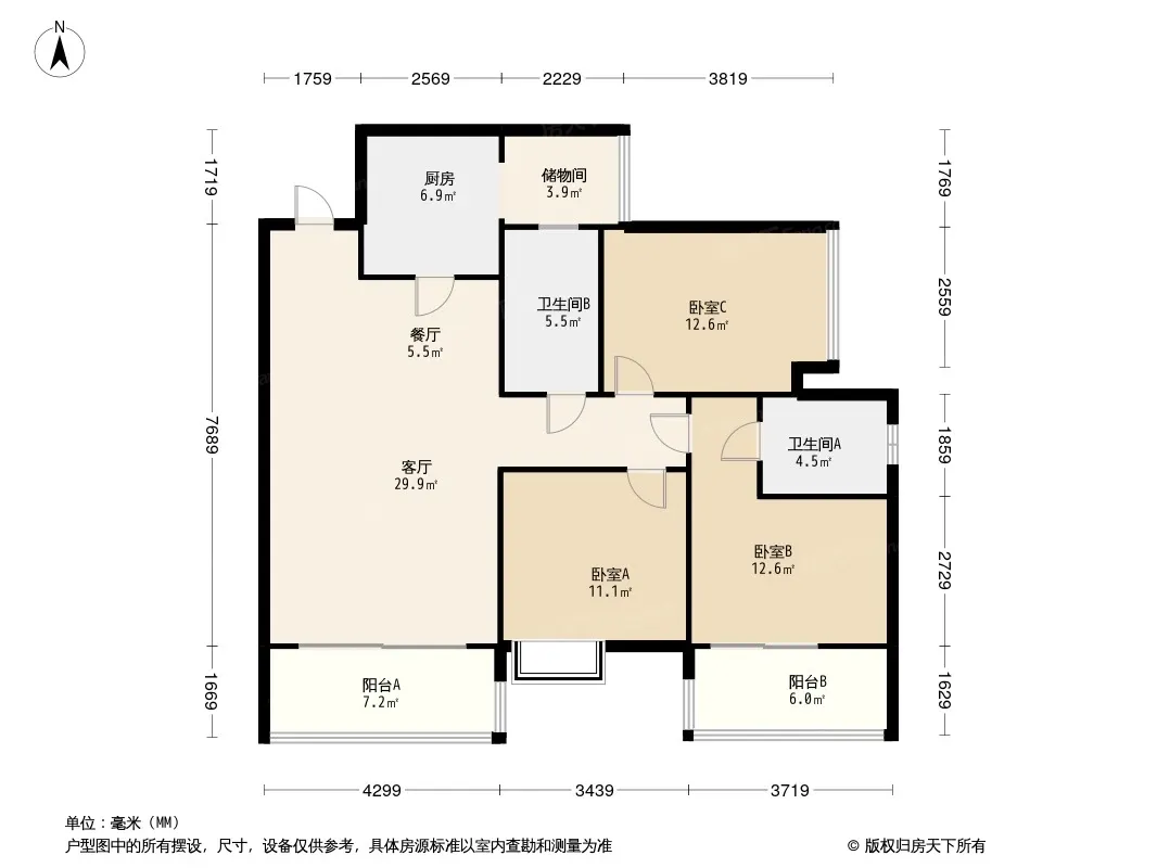 户型齐全,主打动静分离,采光充足三居