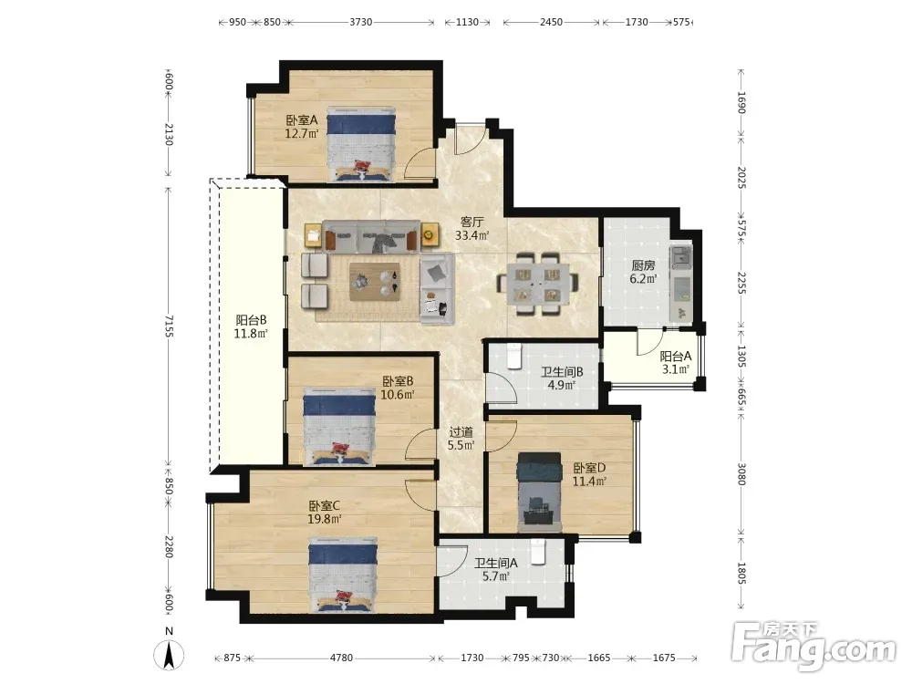 房子是标准的套四双卫户型,户型方正,无浪费空间,客厅带大阳台,动静分区,
