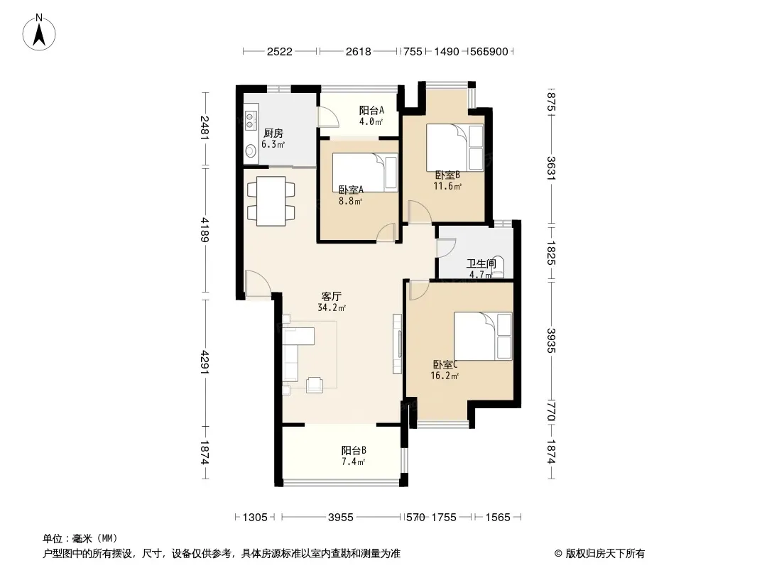 户型齐全,主打明厨,客厅朝南,双卧朝南三居