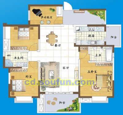 蓝色理想户型主要有103平-151平的户型方正,明卫,双阳台,主卧朝南的三居 、64平-107平的双阳台的二居 、46平-87平的户型方正,双阳台的一居 。