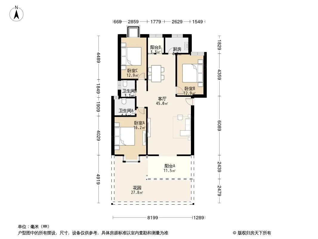 户型齐全,主打明厨,客厅朝南,主卧朝南,明卫,独立衣帽间,双阳台三居