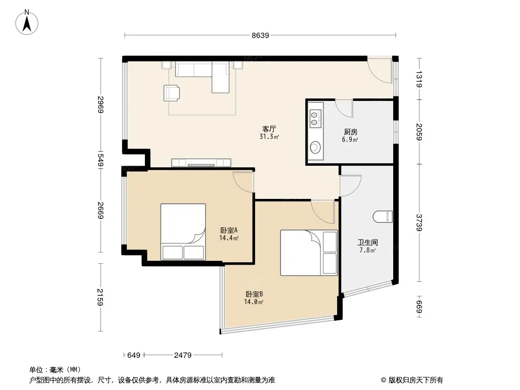 天盛壹中心 2室1厅 西北
