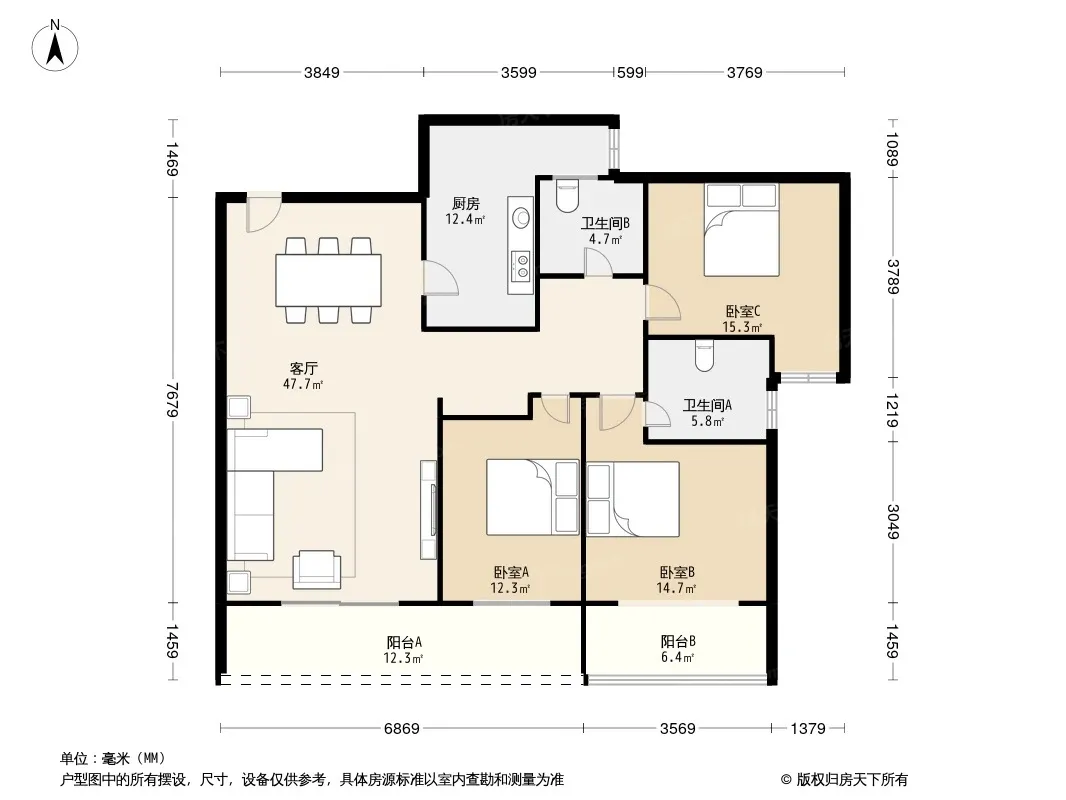 户型齐全,主打明卫,客厅朝南,双卧朝南三居