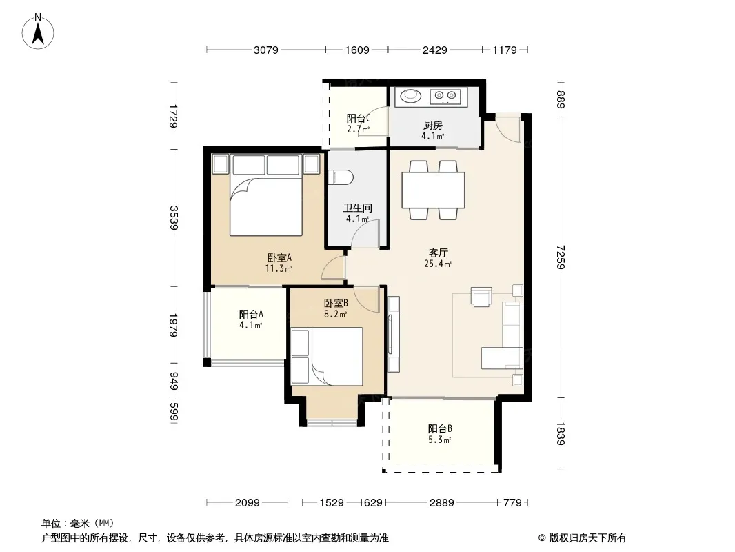 龙湖三千里B区二期 2室2厅 东南