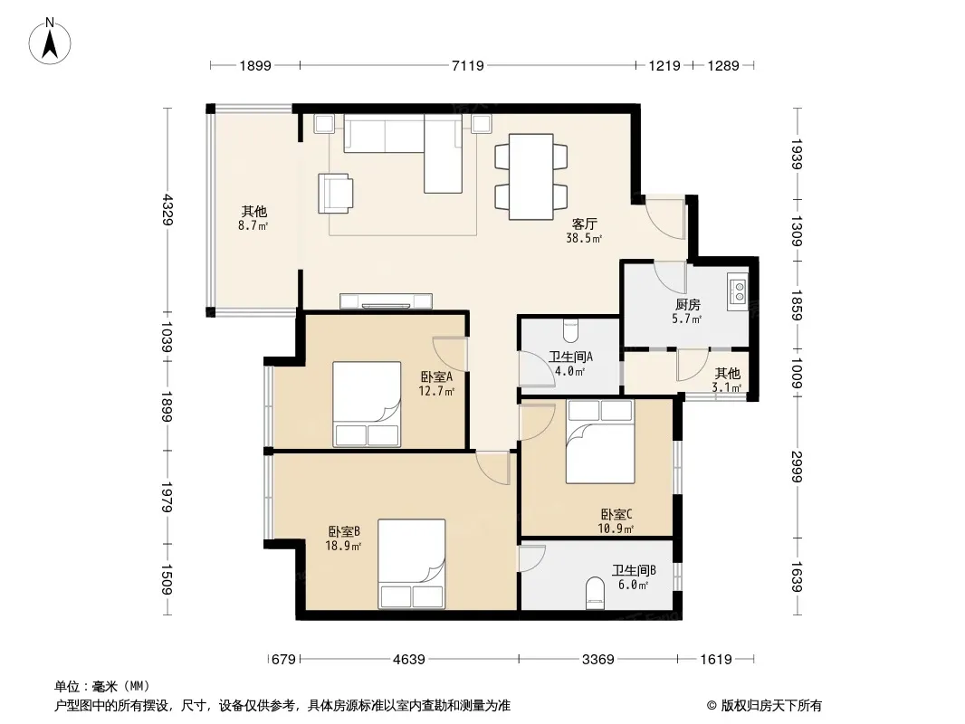 户型齐全,主打户型方正,明厨,独立衣帽间,主卧朝南三居