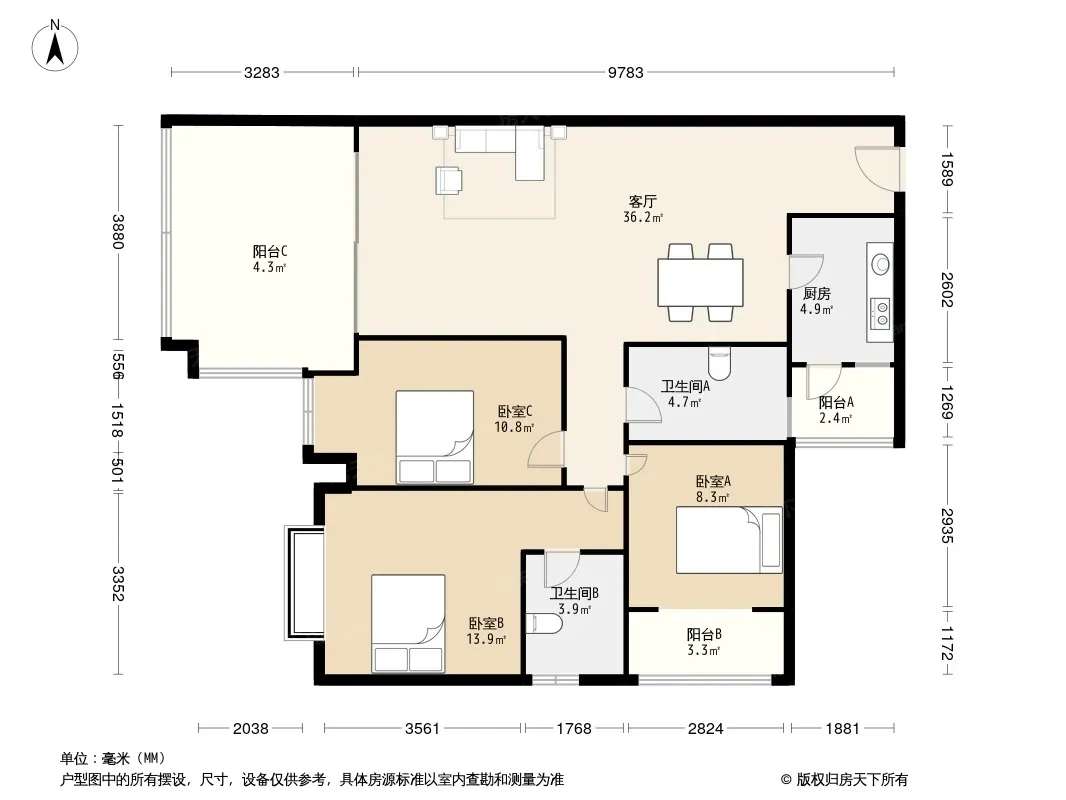 户型齐全,主打明卫,独立衣帽间,双卧朝南三居