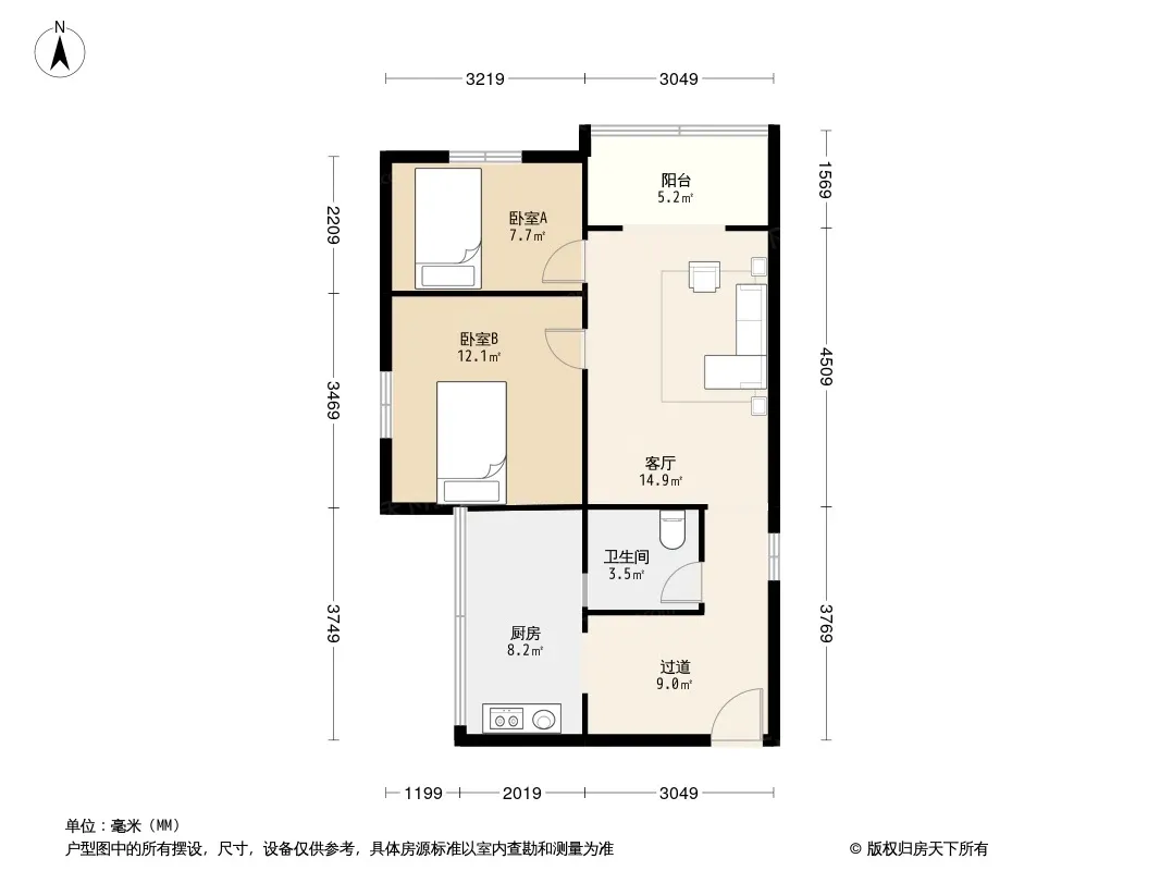 户型齐全,主打户型方正,明卫,明厨,客厅朝南,主卧朝南二居
