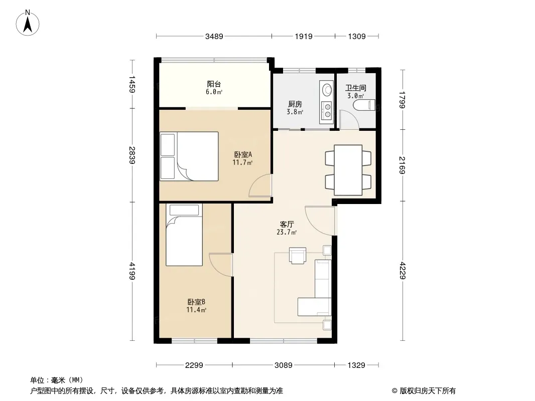 户型齐全,主打户型方正,明卫,明厨,客厅朝南,主卧朝南二居