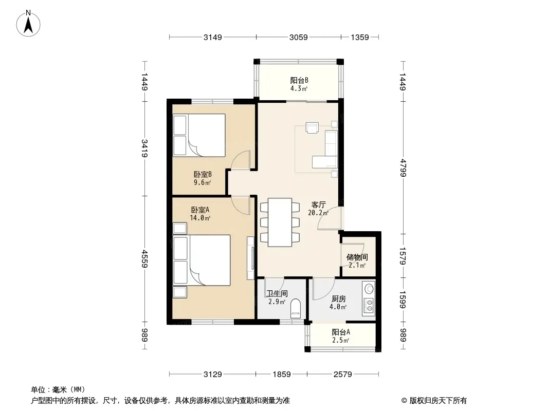 户型齐全,主打户型方正,明卫,明厨,客厅朝南,主卧朝南二居