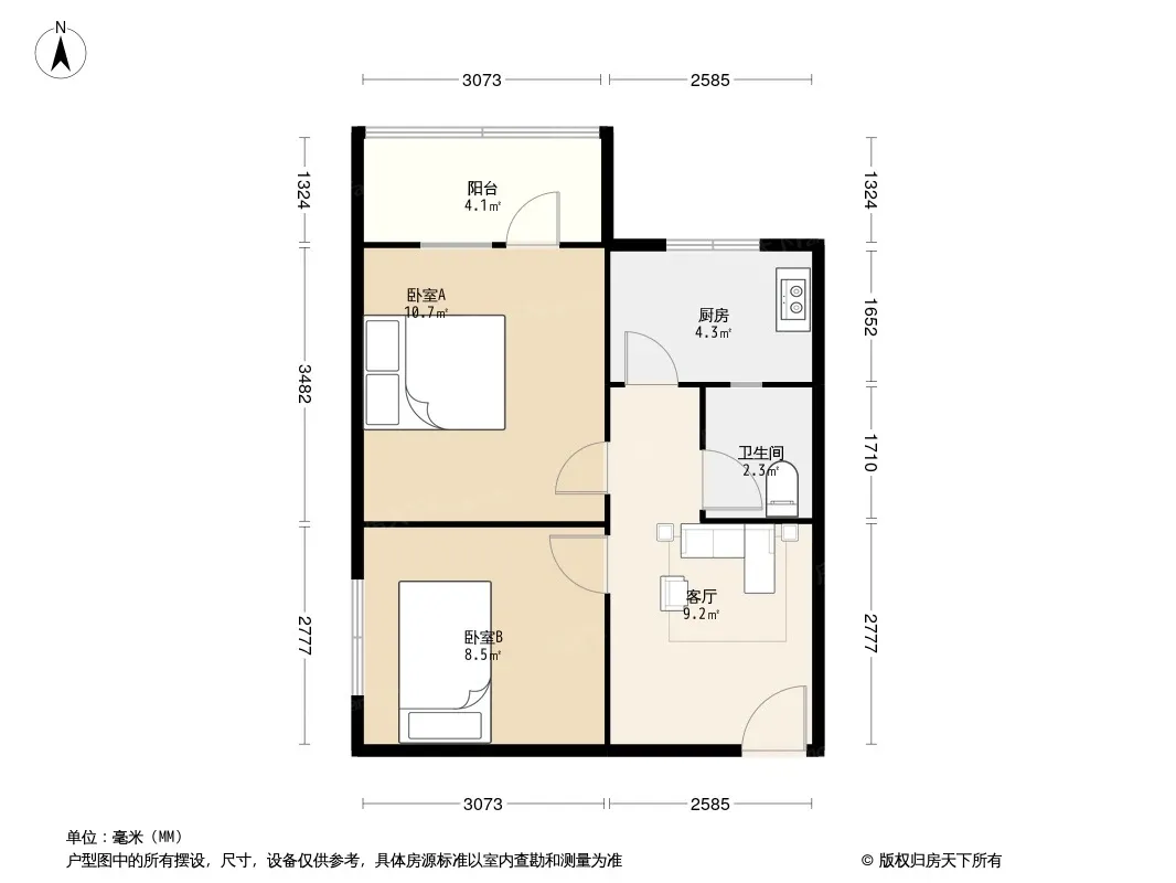 户型齐全,主打明厨,客厅朝南二居