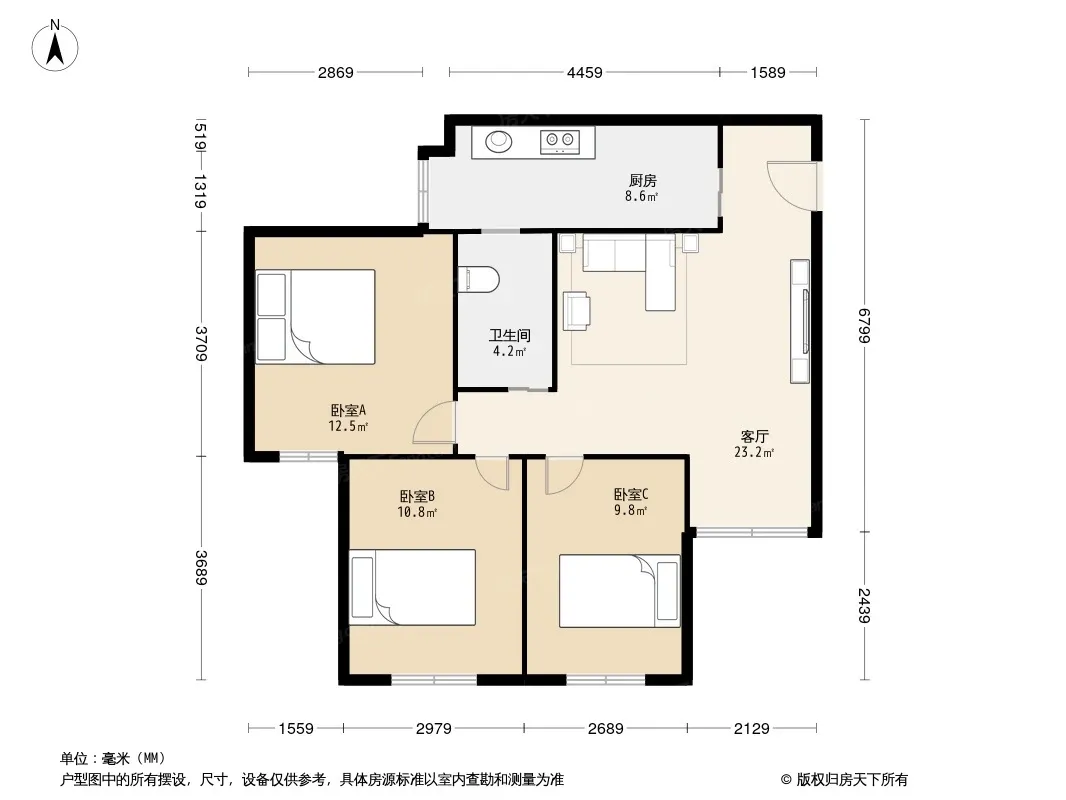 户型齐全,主打明厨,客厅朝南二居