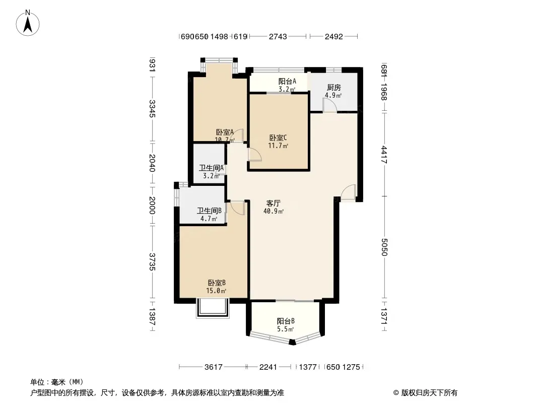 户型齐全,主打户型方正,明卫,客厅朝南,双阳台三居