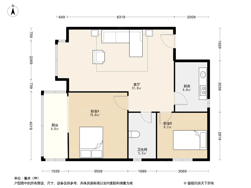 户型齐全,主打明厨,明卫,客厅朝南,全明格局,双卧朝南二居