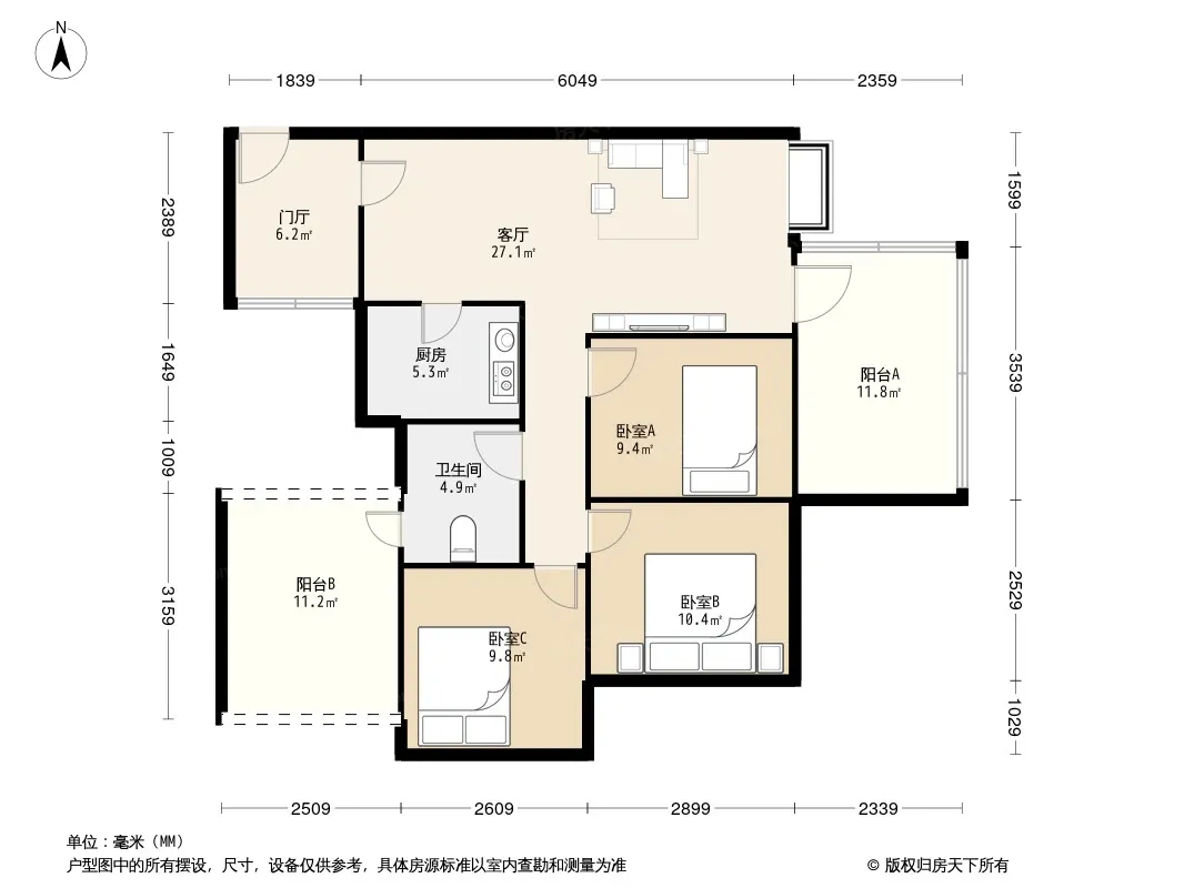 户型齐全,主打户型方正,独立衣帽间,明厨,明卫,客厅朝南三居