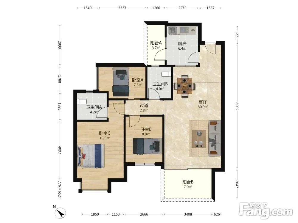 标准的套三双卫,中间楼层,正阳台,视野开阔,无遮挡,有明显的功能分区。