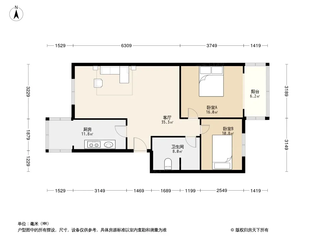 户型齐全,主打明厨,客厅朝南二居