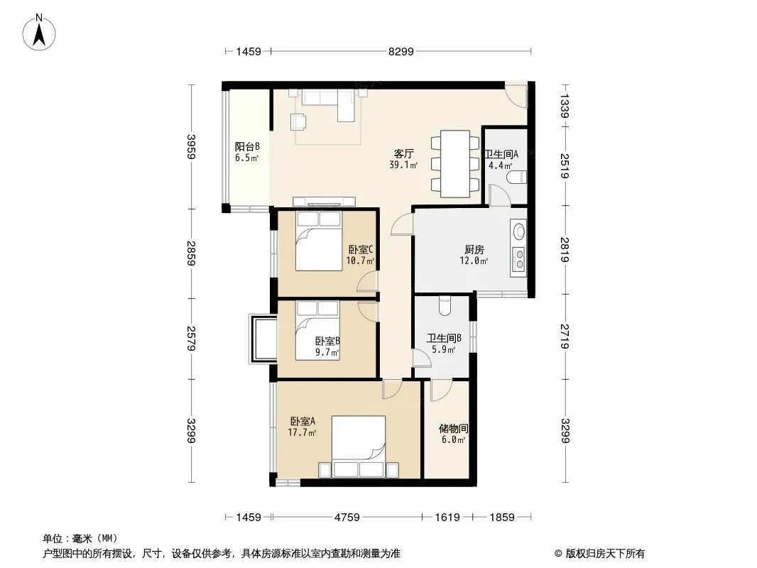 户型齐全,主打明厨,明卫,客厅朝南,全明格局三居