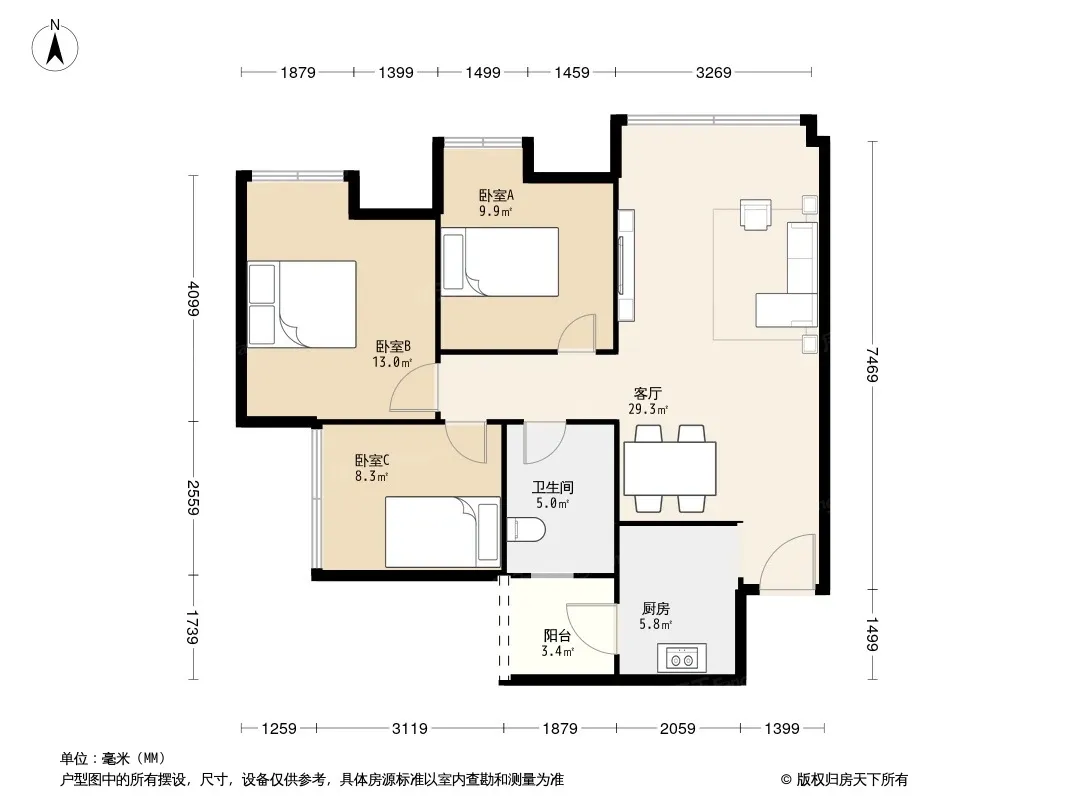上东阳光美悦林 3室1厅 南