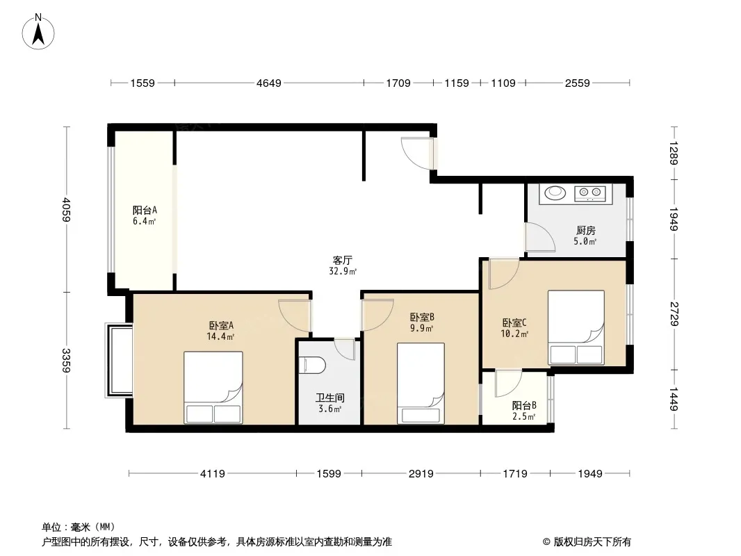 户型齐全,主打户型方正,明卫,明厨,客厅朝南,双阳台三居
