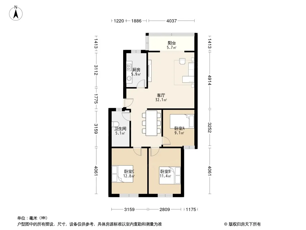 户型齐全,主打明卫,明厨,客厅朝南三居