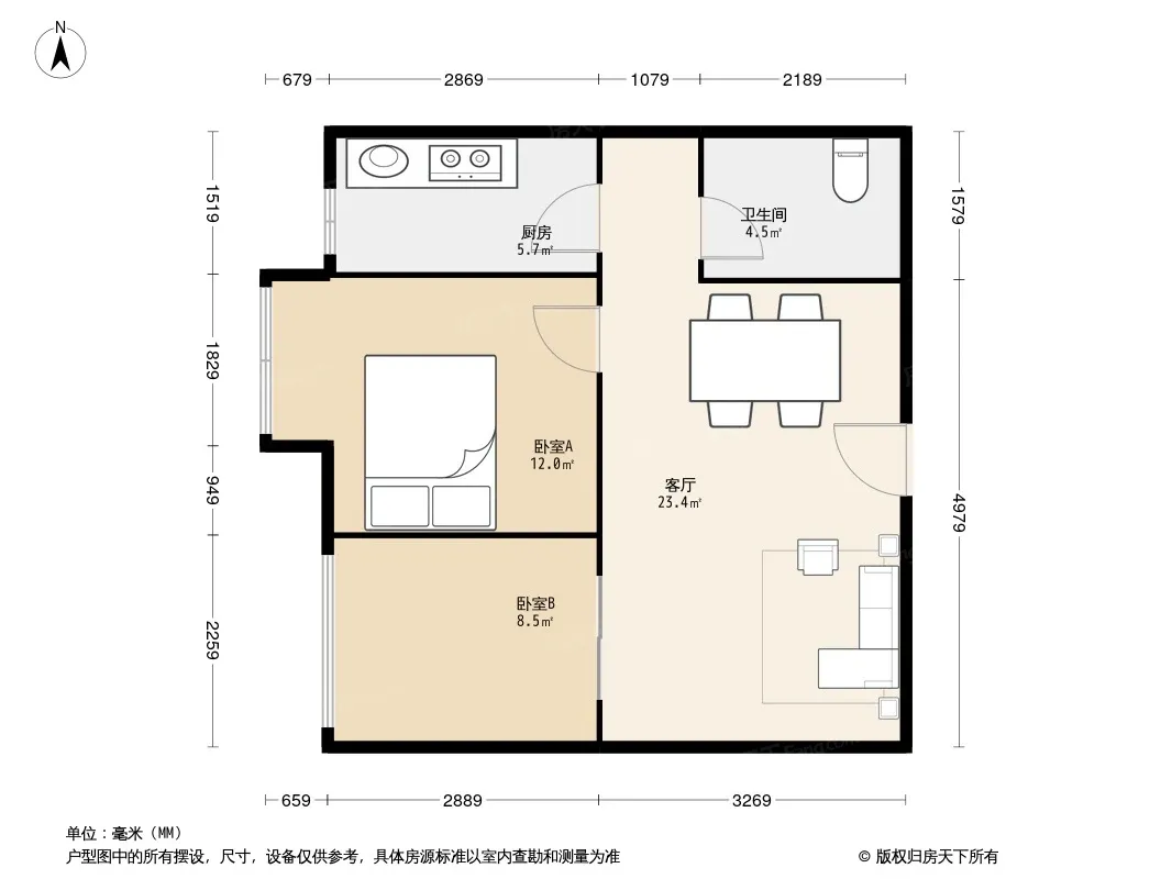 户型齐全,主打客厅朝南二居