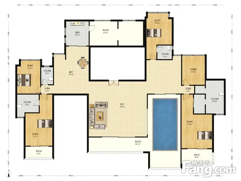 房屋拥有相对宽松的尺寸,布局通透,动静分离,设计豪华
