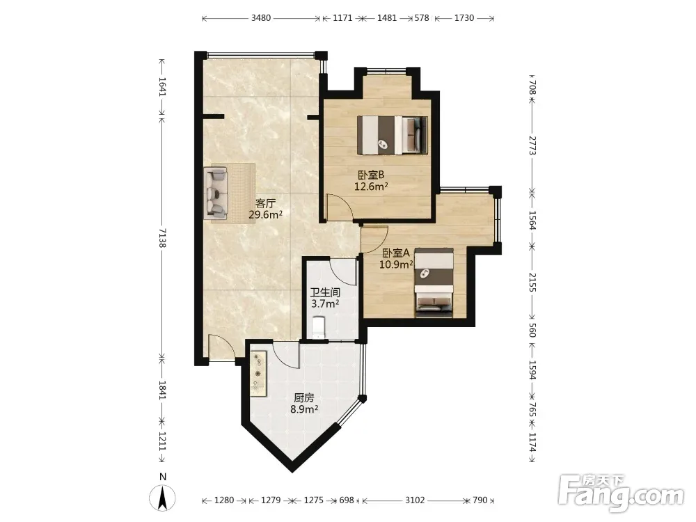 此房大门进入是一个诺大的客厅,竖厅设计,客厅带一个阳台,两个卧室和卫生间在客厅同侧,这是典型的动静分区设计,这样尽量减少动区(客厅)对静区(卧室)的影响,同时客厅墙面比较完整,有利于摆放家具