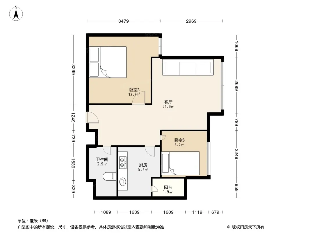户型齐全,主打客厅朝南,双阳台,主卧朝南二居