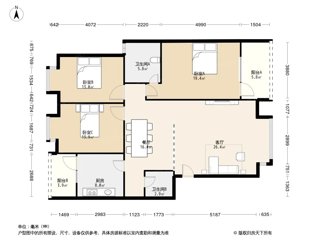 户型齐全,主打户型方正,明卫,客厅朝南,双阳台三居