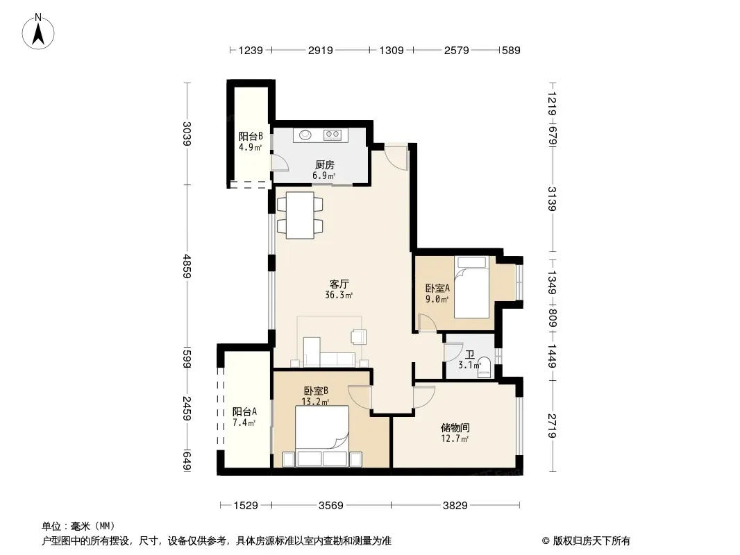 龙湖北城天街一期 3室1厅 南 北