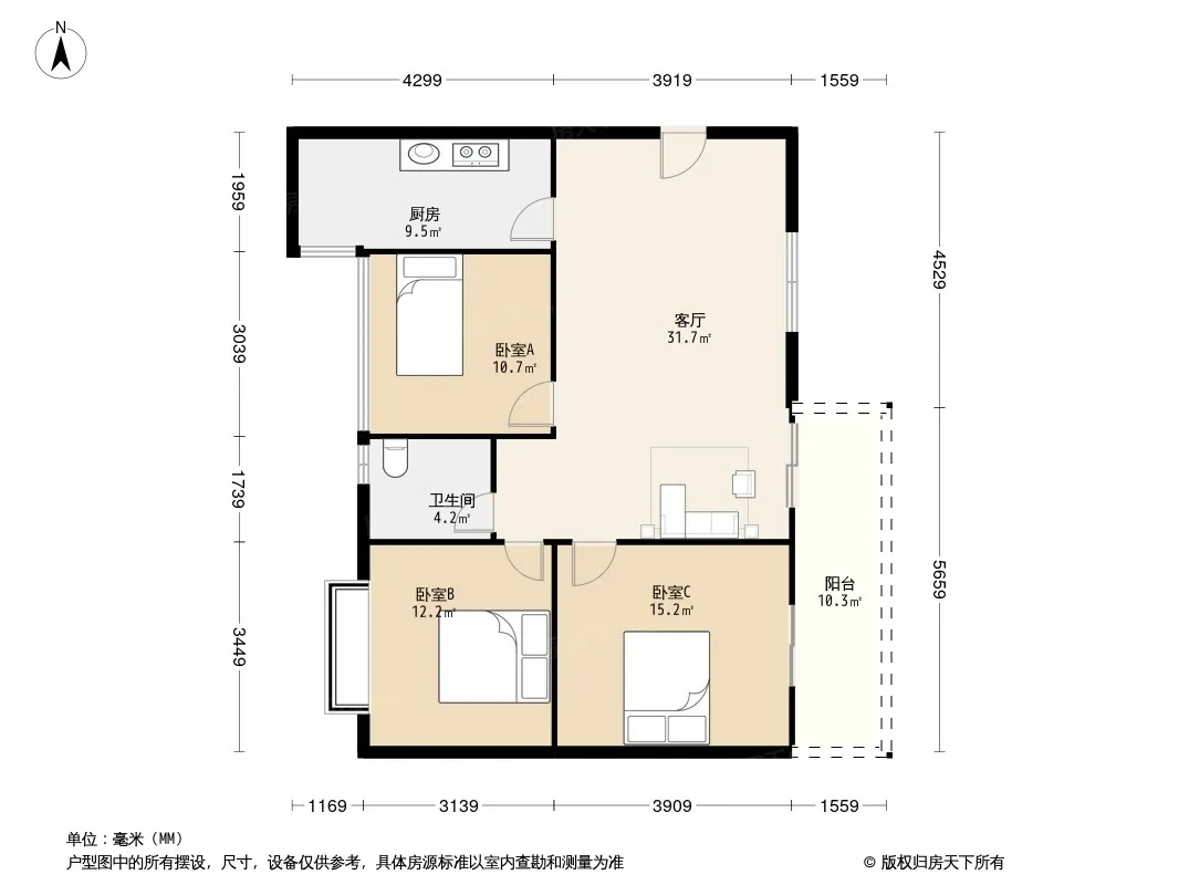户型齐全,主打明卫,明厨,客厅朝南三居