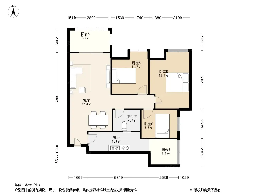 户型齐全,主打明卫,客厅朝南,双阳台三居