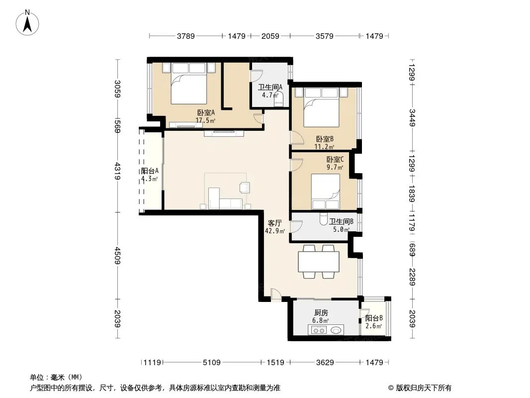 户型齐全,主打户型方正,独立衣帽间,客厅朝南,双阳台三居