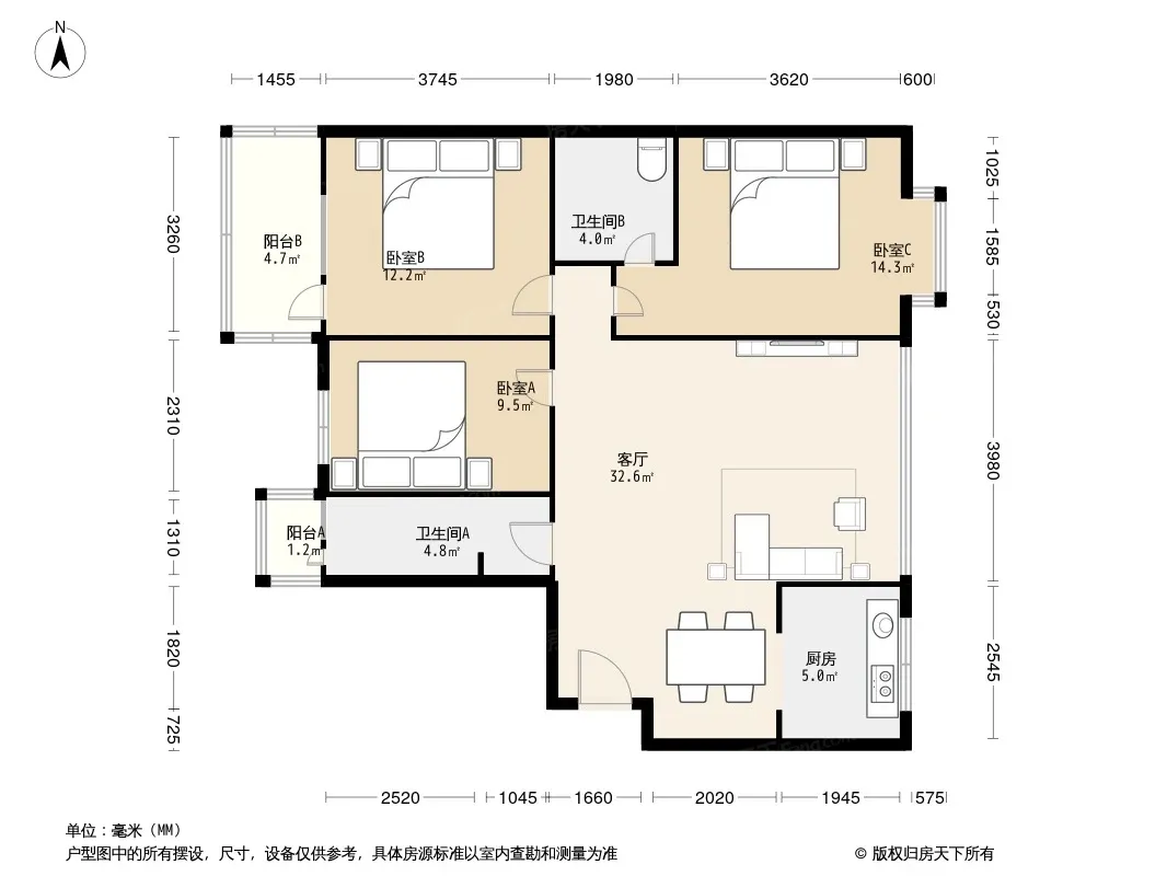 户型齐全,主打明卫,客厅朝南,双阳台三居