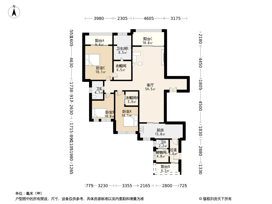 户型齐全,主打户型方正,明卫,独立衣帽间,客厅朝南四居