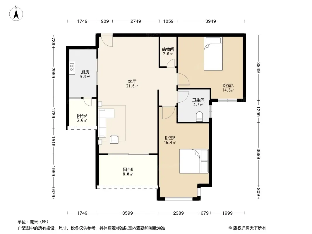 户型齐全,主打明卫,独立衣帽间,双阳台二居