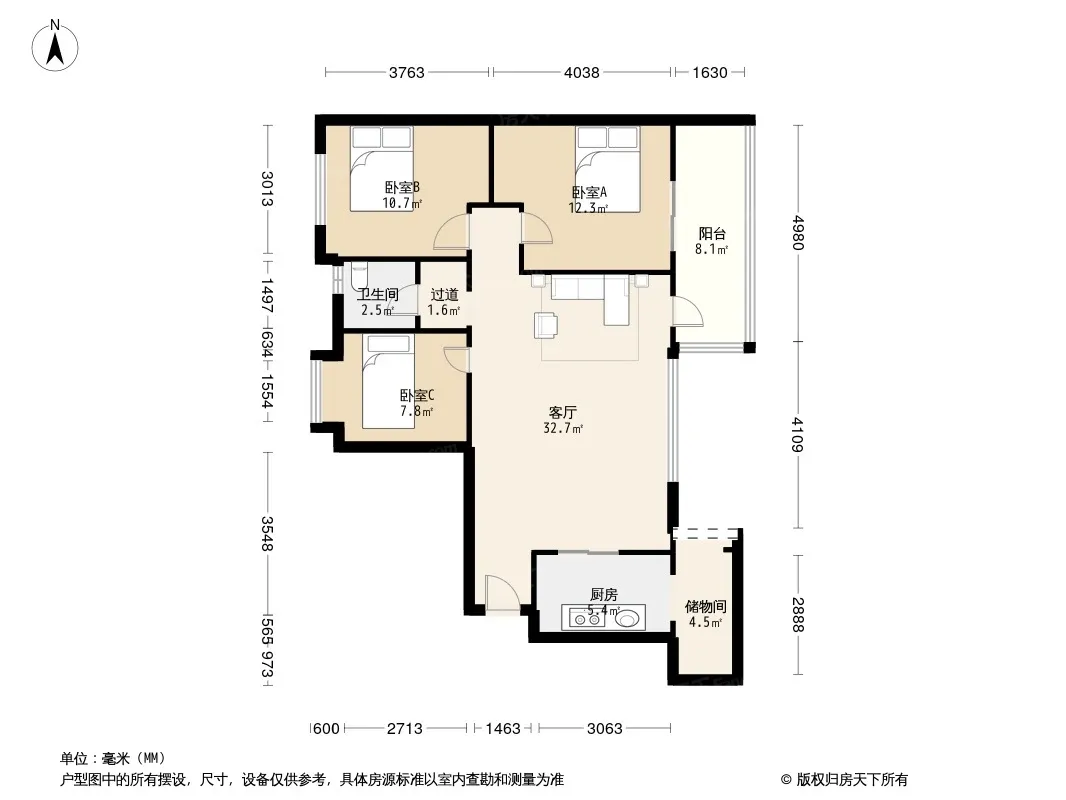 龙湖北城天街二期 3室1厅 西北