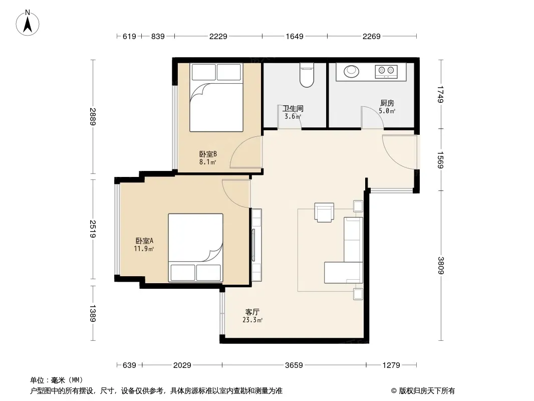 户型齐全,主打户型方正,客厅朝南,双卧朝南,主卧朝南二居