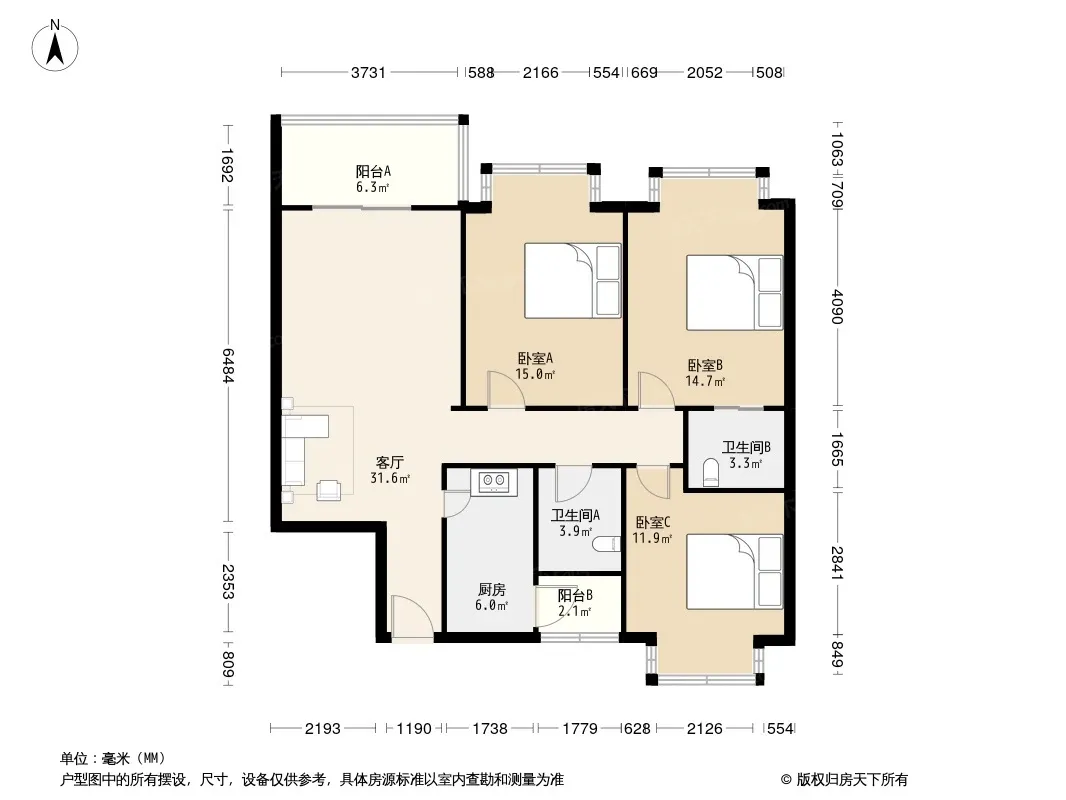 兴元华盛三期 3室1厅 东南