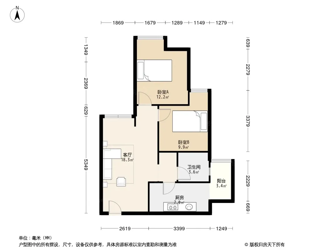 户型齐全,主打客厅朝南,户型方正,明卫三居