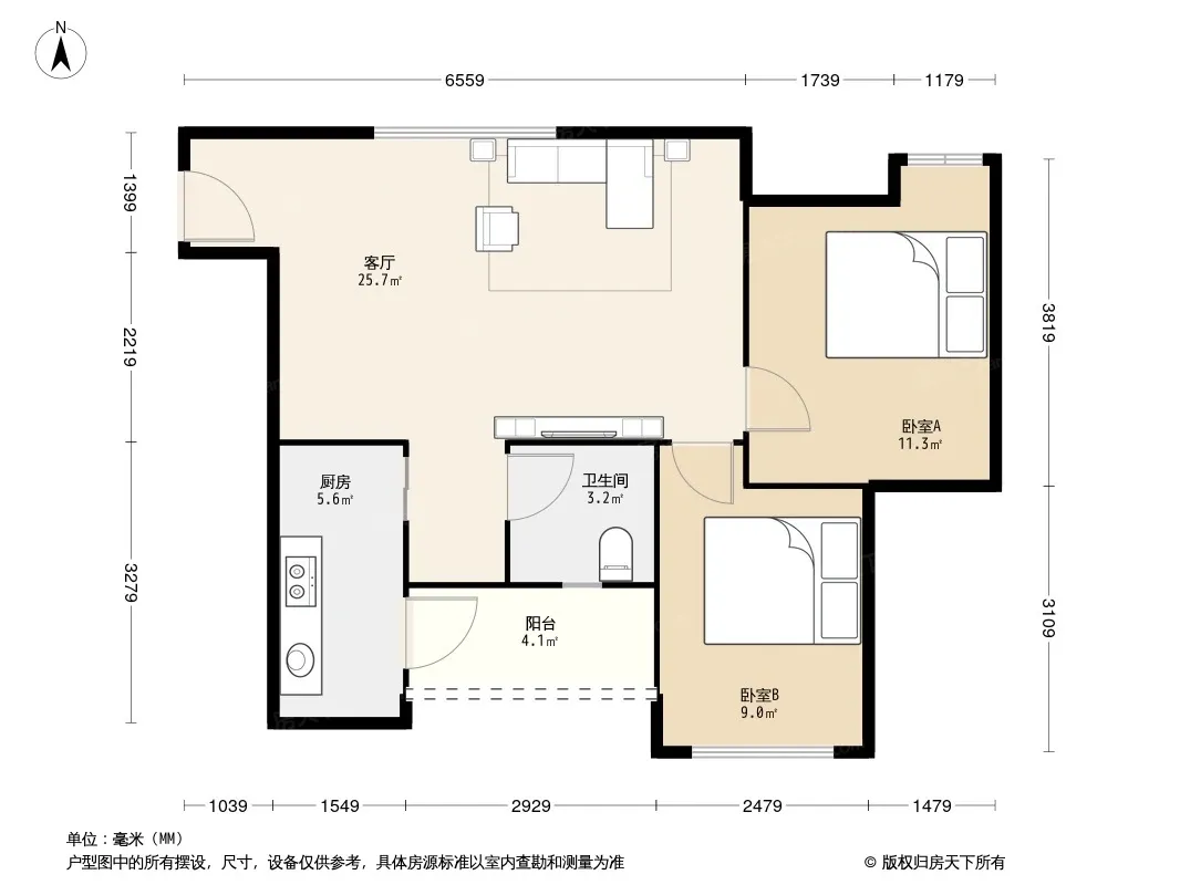 户型齐全,主打客厅朝南,户型方正,明卫三居