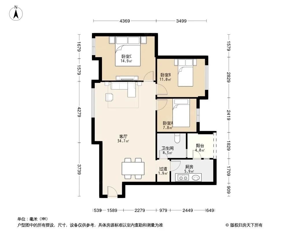 户型齐全,主打客厅朝南,户型方正,明卫三居