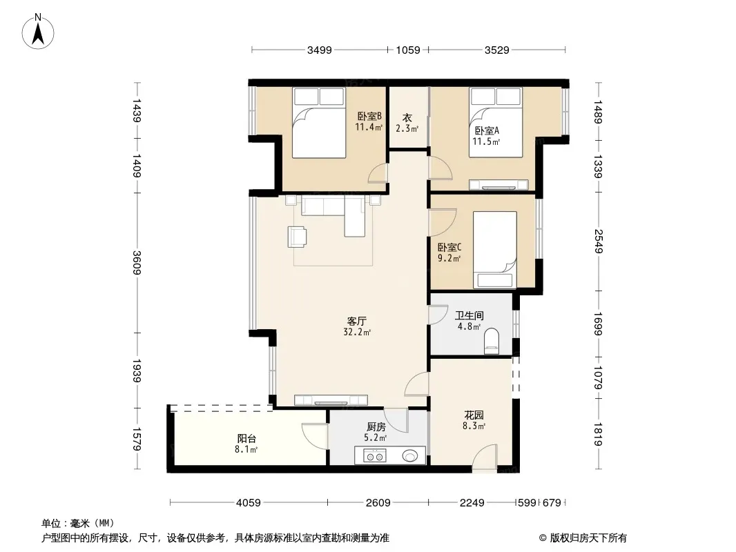 户型齐全,主打户型方正,明卫,客厅朝南,双阳台三居