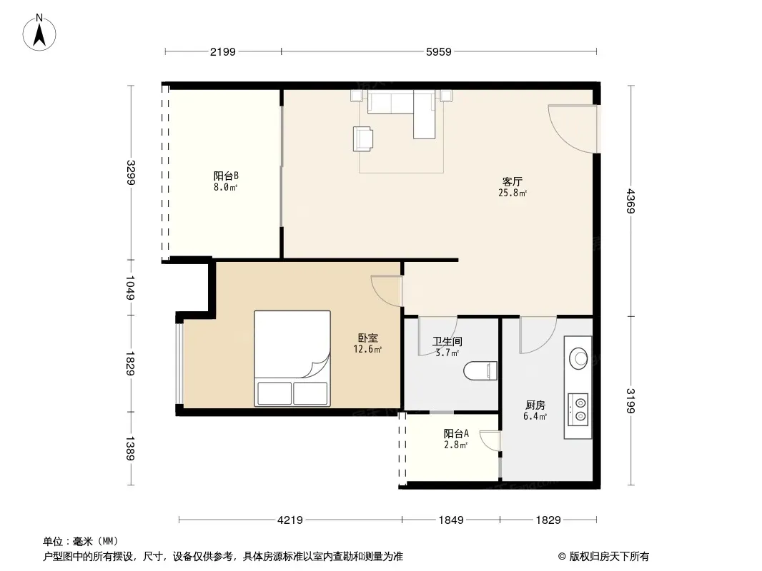 户型齐全,主打明厨,客厅朝南,双卧朝南二居