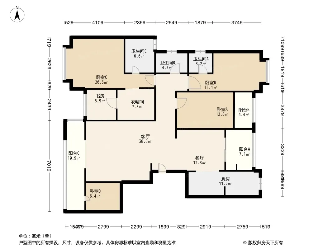 户型齐全,主打独立衣帽间,明卫三居