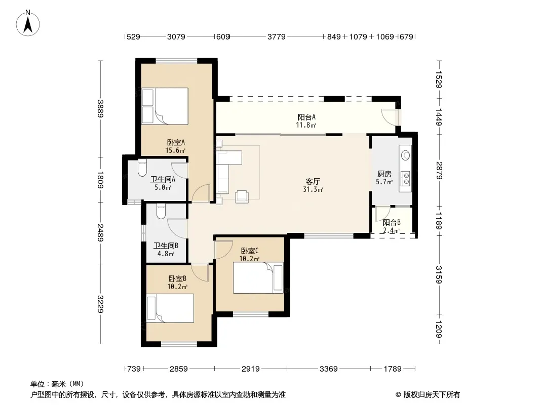 户型齐全,主打户型方正,明卫,客厅朝南,双阳台三居