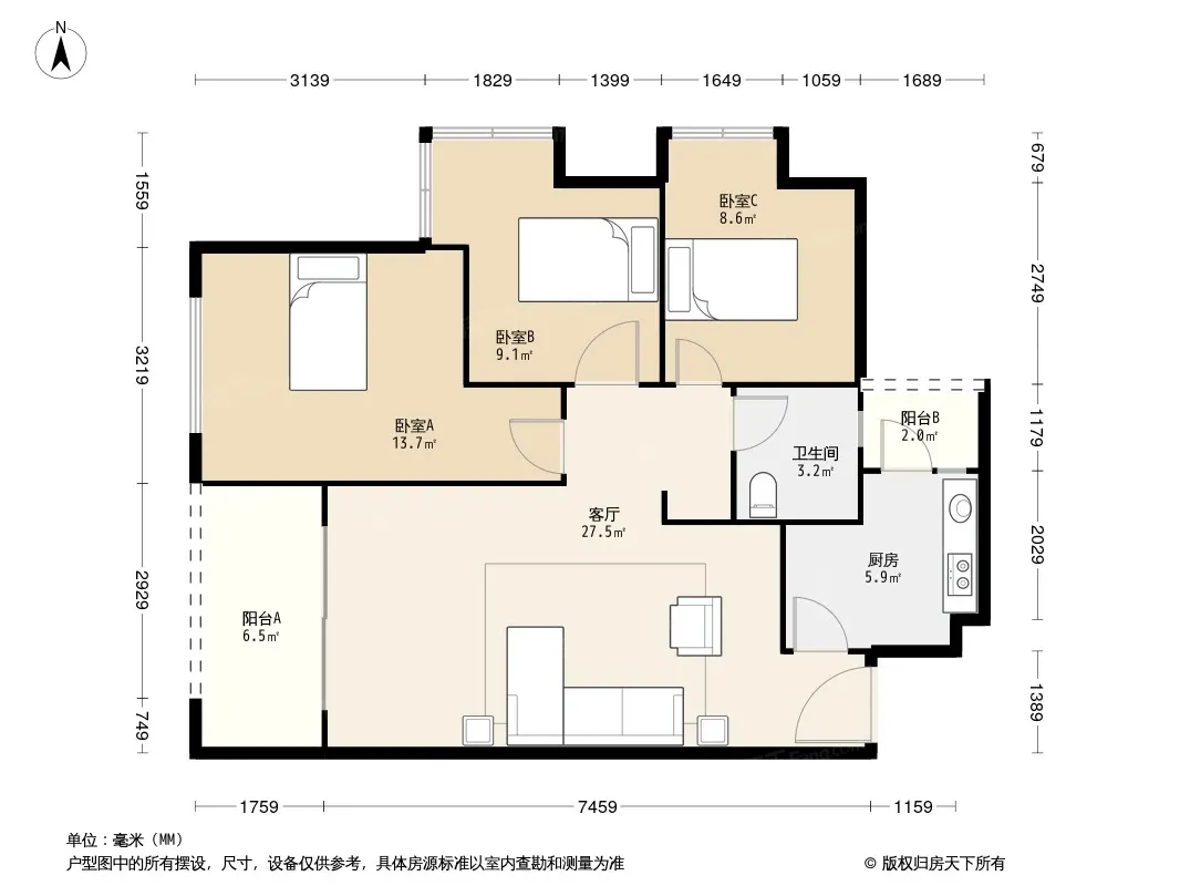 户型齐全,主打高附赠空间,采光充足三居