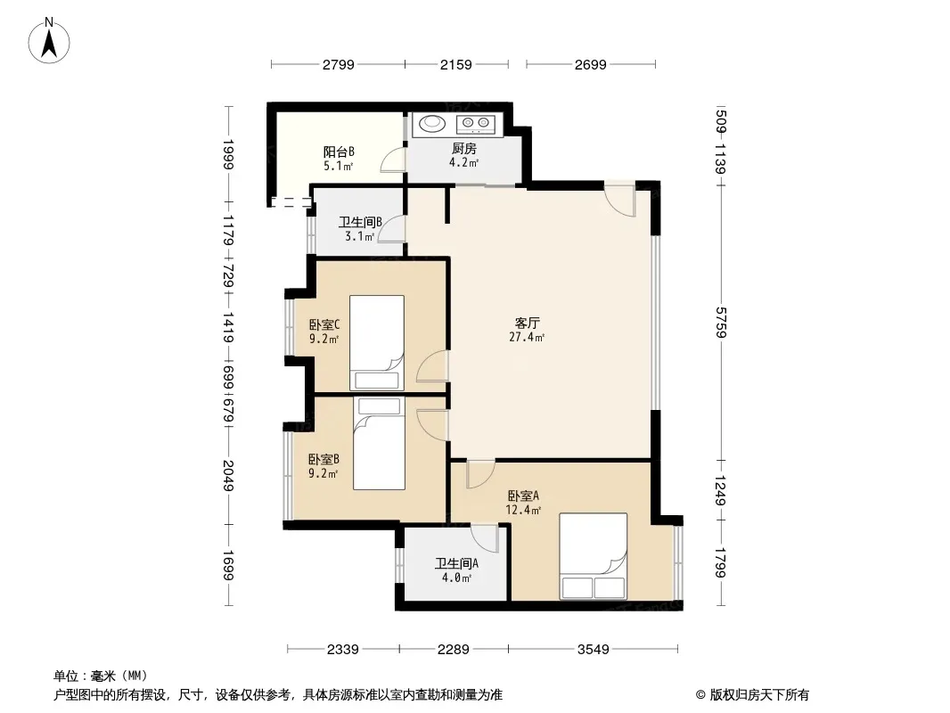 户型齐全,主打南北通透,主卧带卫,观景飘窗,带衣帽间三居