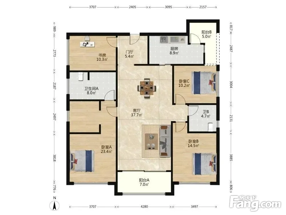 户型齐全,主打明卫,独立衣帽间,明厨,客厅朝南,全明格局,双阳台四居