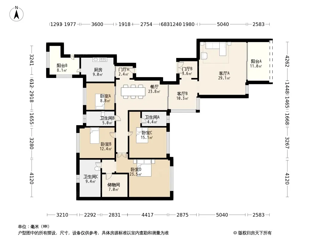 户型齐全,主打明卫,独立衣帽间,明厨,客厅朝南,全明格局,双阳台四居